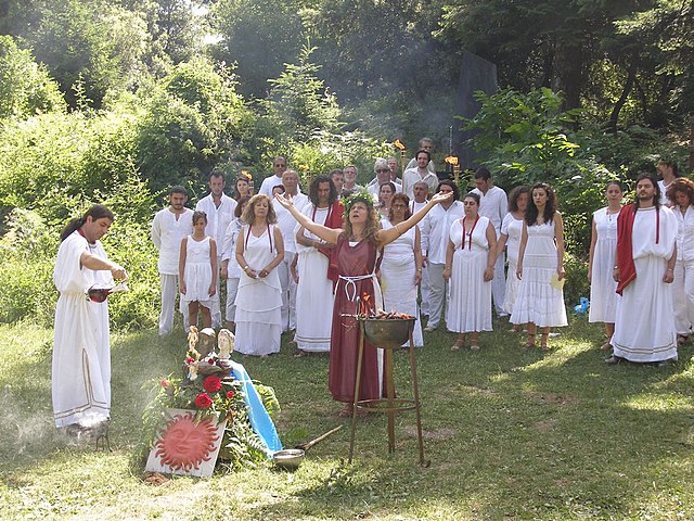 Ritual helênico em honra a Apolo, Afrodite e outros deuses, realizado por membros do YSEE, Conselho Supremo dos Helenos Étnicos. A foto está disponível na seção de galeria do site YSEE.